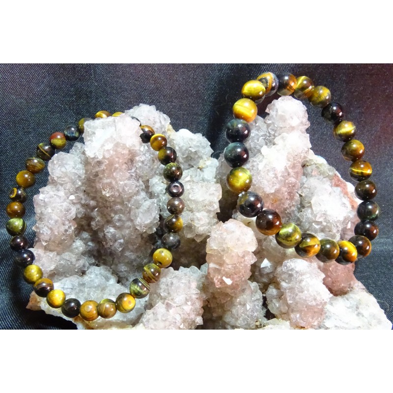 Les bracelets de perles de pierres naturelles d'Oeil de Tigre noir, sont montés avec un élastique très résistant, dans l'atelier Hare krishna.