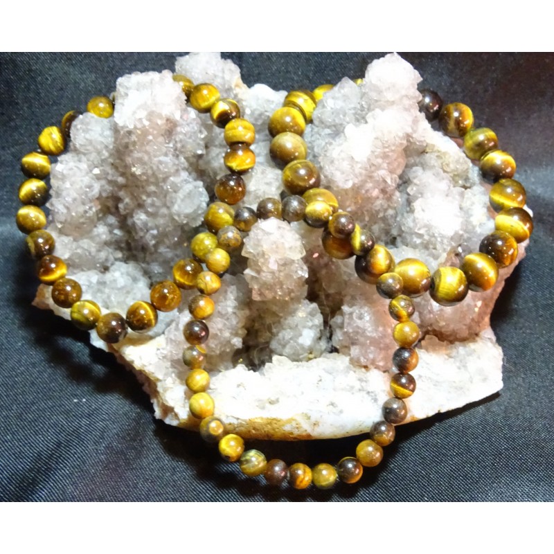 Les bracelets de perles de pierres naturelles d'Oeil de Tigre, sont montés avec un élastique très résistant, dans l'atelier Hare krishna.