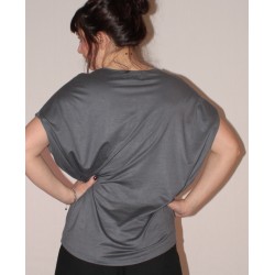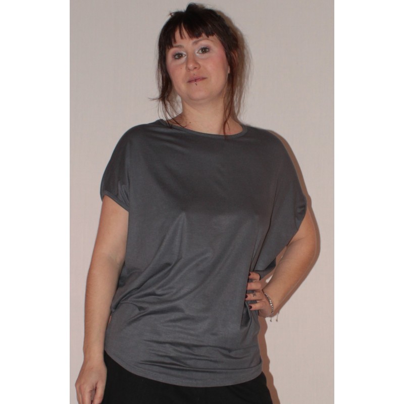 T-shirt femme ample, manches chauve-souris courtes et larges, cintré sur les hanches pour une touche très féminine. Coupé et monté dans un jersey de viscose uni de grande qualité, qui lui confère un magnifique tombé. Vêtement bohème et artisanal, slow fashion.